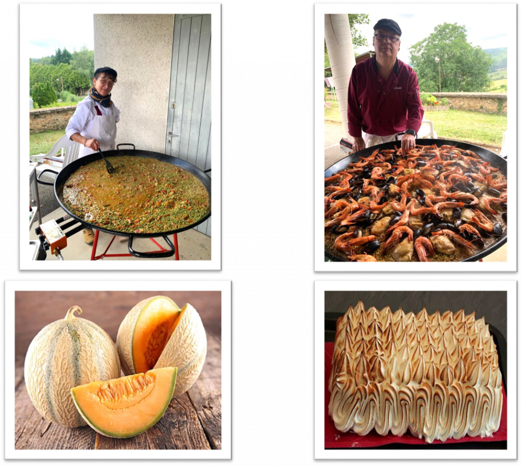 Comme certains résidents ne peuvent plus aller au restaurant, c’est le restaurant qui s’est déplacé ! Dimitri, propriétaire du restaurant « Grenouilles et délices » à Illiat, est venu avec toute sa vaisselle de table. Il est le fils de Frédéric (notre cuisinier) et de Monique son épouse. Antoine, second de cuisine, a préparé les grenouilles en direct.