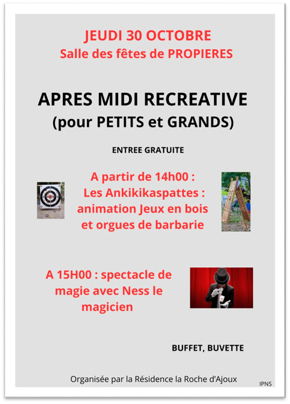 C’est avec plaisir que nous souhaitons vous voir lors l’après midi récréative, ce jeudi 30 octobre à partir de 14h à la grande salle des fêtes de Propières pour partager de bons moments autour de jeux et de chansons avec l’orgue de barbarie d’Ankikikaspatte, sans oublier de rire avec Ness, le Grand Magicien.
